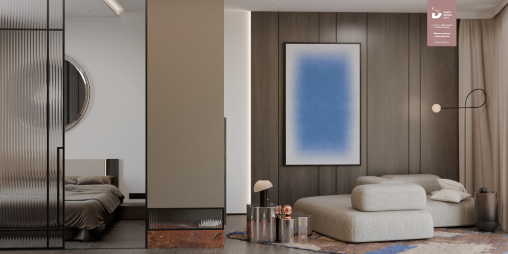 Jednym z kluczowych elementów projektu wnętrza jest przemyślany podział przestrzeni, który zapewnia funkcjonalność i poczucie intymności. Część sypialna została oddzielona od strefy dziennej za pomocą stylowych, przeszklonych drzwi o subtelnej, ryflowanej fakturze. Rozwiązanie to pozwala na wizualne wydzielenie poszczególnych stref, jednocześnie zachowując przepływ światła i spójność całej aranżacji.